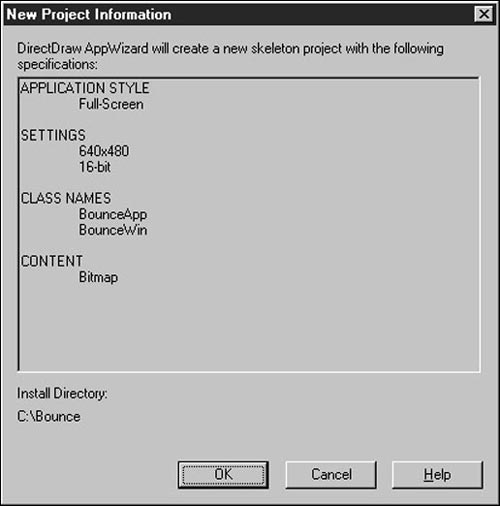 Если вы работали с Visual C++, то вам почти наверняка приходилось пользоваться AppWizard. AppWizard представляет собой специальное приложение, работающее в среде Visual C++. По вашим указаниям он генерирует целый проект вместе со всеми исходными текстами. Хотя сам термин подразумевает, что AppWizard генерируют только приложения, некоторые из них создают библиотеки, управляющие элементы OLE и даже другие AppWizard. Важно понять, что AppWizard позволяет быстро и легко заложить основу для работы над проектом. Несколько AppWizard поставляются вместе с Visual C++, самый известный из них предназначен для создания MFC-приложений. Наш нестандартный DirectDraw AppWizard создает приложения DirectDraw. Для установки DirectDraw AppWizard можно воспользоваться инсталляционной программой с CD-ROM или просто скопировать с диска файл AppWizard (с расширением AWX) в каталог с шаблонами Visual C++.Создание приложения Bounce