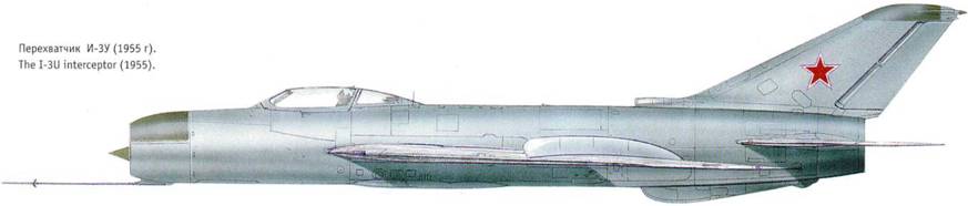Согласно вышеназванным постановлениям новый истребитель-перехват-чикдолжен был строиться в двух вариантах - И-7У и И-7К. Первый требовалось предъявить на госиспытания в IV квартале 1956 года, второй - в I квартале следующего года. На первом опытном экземпляре (И-7У) предполагалось использовать пушечное и неуправляемое ракетное вооружение, на втором (И-7К) - только ракетное: два управляемых снаряда К-6 или вместо них два блока с восемью снарядами АРС-57 в каждом, кроме того в крыле дополнительно могли устанавливаться четыре автомата с четырьмя снарядами АРС-57 в каждом. Здесь стоит напомнить, что еще в начале 50-х годов вышло несколько правительственных постановлений о создании управляемого ракетного авиационного вооружения для авиационных комплексов перехвата воздушных целей. Проектирование снарядов было поручено одновременно нескольким конструкторским бюро. Так в ОКБ-2 (Министерства оборонной промышленности) под руководством П. Д. Грушина создавались ракетные системы К-5, К-6 и К-51, в 0КБ-134 И. И. Торопова системы К-75 и К-7 (в вариантах К-7л с управлением по лучу радиолокатора и К-7с с головкой самонаведения), в 0КБ-4 (МОП) М. Р. Бисновата система К-8 (также в двух вариантах с управлением по лучу и самонаведением). Постановление Совета Министров СССР об испытании этих систем в составе ряда авиационных комплексов вышло 30 декабря 1954 года. Эскизный проект И-7У был закончен 23 июля 1956 года и утвержден А. И. Микояном 21 августа. Самолет представлял собой среднеплан с крылом стреловидностью 55° и носовым цилиндрическим воздухозаборником с центральным телом в виде конуса, в котором размещалась антенна РЛС. Вооружение состояло из двух пушек НР-30 (с боезапасом по 80 снарядов на каждую), расположенных в корне крыла, но более «прижатых» к фюзеляжу. Самолет дополнительно мог нести 16 неуправляемых снарядов АРС-57 в четырех блоках под крылом. Под фюзеляжем мог подвешиваться дополнительный топливный бак. Пилот защищался бронеплитой, установленной спереди, бронезаголовни-ком и передним бронестеклом (общий вес брони составлял 59,8 кг), В нижней части фюзеляжа (в районе стыка с крылом) на уровне передней кромки крыла устанавливались два тормозных щитка. Основное радиооборудование перехватчика состояло из радиолокационной станции «Алмаз», станции системы наведения на цель «Лазурь», радиостанции РСИУ-4Б, аппаратуры системы слепой посадки ОСП-48 (в составе автоматического радиокомпаса АРК-5, сопряженного с аппаратурой управления полетом, радиовысотомера РБ-5 и маркерного приемника МРП-48П), аппаратуры «Глобус-2» и запросчика-от-ветчика СРЗО-2 («Хром-Никель»). Контроль за стрельбой осуществлялся фото-кинопулеметом СШ-45. Электропитание осуществлялось от генераторов ГС-12Т и СГ0-8Г, а также преобразователя ПО-750 и двух аккумуляторов 15СЦС-45. Как и в самолете И-3У, на И-7У применялся автопилот АП-Зб, предназначенный специально для работы в системе «Ураган-1». Летные характеристики самолета рассчитывались под двигатель АЛ-7Ф с номинальной тягой 6300 кг, тягой на максимальном режиме 7500 кг и на форсаже 10 000 кг.