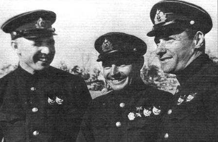 Однополчане Б, Ф. Сафонова (слева направо): гв. капитан П. И. Орлов, гв. капитан А. А. Коваленко и гв. стар-ший лейтенант В. П. Покровский. Лето 1942 г., аэродром Ваенгз-1, (Фото из фондов музея Краснознаменного Северного Флота).