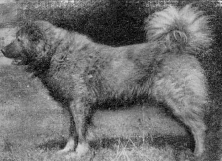 Конституция крепкая — сухая. Тип высшей нервной деятельности уравновешенный — подвижный. Высота в холке: у кобелей 67–70 см, у сук 60–65 см; высота в крестце примерно на 1–2 см меньше. Индекс растянутости 110. Типичный аллюр — низкая, стелющаяся рысь. Костяк крепкий, массивный. Мускулатура хорошо развитая, сухая. Кожа эластичная, складок и отвислостей не образует. Шерсть густая, грубая, с сильно развитым подшерстком. Волос плотно прилегающий, прямой, относительно длинный; на голове, ушах, передних сторонах ног — более короткий. Украшающий волос не выделяется. Встречаются длинношерстные собаки: длинный волос покрывает уши и ноги, делая их лохматыми, образует гриву, очесы на ногах и подвес на хвосте. Масть разнообразная: зонарносерая различных оттенков; чепрачная с различными тонами основного фона и чепрака; черная и черная с серыми, рыжими и бурыми подпалинами; бурая, палевая, тигровая; белая или белая с желтизной. Допускаются небольшие белые пятна на груди и пальцах. Голова при осмотре спереди клинообразная, массивная, умеренно широкая в черепной части, со слегка округленными скулами. Лоб от затылочного бугра плоский, в своей передней части немного выпуклый. Переход от лба к морде плавный, малозаметный. Линия морды параллельна плоскости лба, морда заостренная, немного короче половины головы. Губы сухие, натянутые, плотно прилегающие к челюстям. Нижняя губа у своего основания образует небольшой угол. Мочка носа крупная, черного цвета. Уши стоячие, высоко поставленные с острыми концами, направленными вперед и вверх. Глаза овальной формы, косо поставленные, окрашенные в тон с мастью. Зубы крупные, белые, прикус ножницеобразный. Шея крепкая, сухая, мускулистая, нормально поставленная; длина шеи примерно равна длине головы. Грудь овальной формы, широкая, глубокая и длинная. Холка мускулистая, высокая, хорошо выраженная. Спина прямая, широкая. Поясница короткая, мускулистая, немного выпуклая, незаметно переходящая к крупу. Круп широкий, округлый, мускулистый, плавно опускающийся к основанию хвоста. Живот умеренно подтянут. Плечи с хорошо развитой мускулатурой. Углы плече-лопаточных сочленений 90–100°. Предплечья прямые, массивные, отвесно поставленные. Запястья хорошо развитые. Пясти длинные, поставленные наклонно. Задние конечности (при осмотре сзади) параллельные. Бедра сильные, мускулистые. Колени округлые. Голени длинные, поставленные наклонно, способствующие характерному для этой породы оттягиванию назад скакательных суставов. Скакательные суставы сухие, с четко обрисованными углами, отставленными за линию седалищных бугров. Плюсны крепкие, отвесно поставленные. Лапы овальной формы, сжаты в комок. Прибылые пальцы должны быть отрезаны у щенков. Хвост саблевидной формы, доходящий последним позвонком до пяточной кости. В спокойном состоянии собака держит его опущенным вниз, в возбужденном — поднимает вверх так, чтобы первая треть его длины шла на одной линии со спиной, а остальные две трети постепенно поднимались вверх.Кавказская овчарка (рис. 11). Эта древняя порода пастушьих собак распространена в СССР на больших территориях. В зависимости от местных условий и способов содержания сложилось несколько типов. Кавказская овчарка применяется в основном для охраны овечьих стад в Грузинской, Армянской и Азербайджанской ССР, Ставрополь
