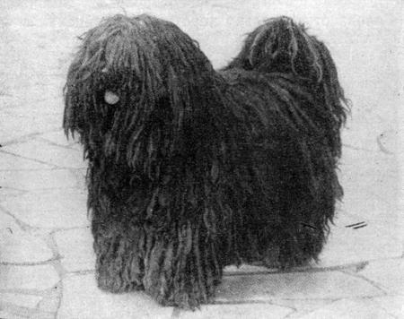 Конституция крепкая — сухая. Тип высшей нервной деятельности уравновешенный — подвижный. Высота в холке: у кобелей не меньше 63 см, у сук не меньше 60 см; высота в крестце равна высоте в холке или на 1–2 см меньше. Индекс растянутости 108–110. Типичный аллюр — ускоренная рысь и тяжелый, но быстрый галоп. Костяк крепкий, массивный, Мускулатура хорошо развитая. Кожа эластичная, натянутая, без складок и отвислостей. Шерсть длинная, густая, косматая, грубая, немного волнистая, одинаково длинная на всем теле собак. Длина волос 10–15 см, а у отдельных животных достигает 30–35 см. Подшерсток хорошо развитый, длинный, он связывает и спутывает длинный остевой волос, поэтому шерсть южнорусских овчарок имеет свойство сваливаться в войлок. Масть белая, белая с желтоватым оттенком на голове, ушах, спине и хвосте, серая разных оттенков, серо-пегая и белая с серыми пятнами. Голова удлиненная, умеренно широкая, скуловые дуги и затылочный бугор заметно выступают. Переход от плоского лба к морде слабо выражен. Морда короче черепной части, массивная, заостренная, верхняя линия ее параллельна плоскости лба. Губы сухие, плотно прилегающие. Глаза небольшие, овальной формы, прямо поставленные, темные. Уши висячие, небольшие, треугольной формы, покрытые длинной шерстью. Мочка носа крупная, у белых собак — черного, серого или коричневого цветов, у собак всех других мастей — черного. Зубы белые, здоровые, крупные, прикус ножницеобразный. Шея сухая, мускулистая. Грудь умеренно широкая, глубокая. Холка хорошо развитая. Спина прямая, крепкая, широкая. Поясница широкая, сильная, выпуклая. Круп широкий, мускулистый, почти горизонтально поставленный. Живот подтянут выше линии груди. Передние конечности по длине равны половине высоты в холке или несколько больше ее. Углы плечелопа-точных сочленений 90–100°. Предплечья прямые, отвесно поставленные. Запястья широкие. Пясти широкие, длинные, поставленные несколько наклонно. Задние конечности (при осмотре сзади) параллельные. Бедра длинные, поставленные прямо. Коленные суставы выпрямлены. Голени длинные, поставленные наклонно. Скакательные суставы хорошо выражены. Плюсны массивные, длинные. Лапы крупные, овальной формы, сжатые в комок, покрыты длинной шерстью, отчего кажутся большими и широкими. Хвост по длине доходит до скакательных суставов, опущен вниз и свернут в полукольцо.Пули (рис. 14). Это древняя пастушья собака, выведенная венгерскими пастухами. Близка по своему происхождению к космато-шерстным овчаркам Европы. В большом количестве распространена в Закарпатской области УССР. В настоящее время пули завезена в колхозы Ставропольского края и Оренбургской области. Применяется только для пастьбы овец. Для защиты стад от хищников она непригодна из-за своей малорослости и слабосильности.