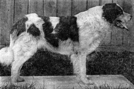 Конституция грубая. Тип высшей нервной деятельности уравновешенный — спокойный. Высота в холке: у кобелей не меньше 66 см, у сук не меньше 63 см; высота в крестце равна высоте в холке или на 1–2 см меньше. Индекс растянутости 106–108. Аллюр — ускоренная рысь, тяжелый галоп. Костяк грубый, массивный. Мускулатура массивная, хорошо развитая. Кожа толстая, образующая складки под гортанью. Шерсть длинная, густая, с хорошо развитым подшерстком. Волос прямой и волнистый. Украшающие волосы хорошо развиты и выделяются на ушах, шее, конечностях и на хвосте. Масть белая с рыжими и бурыми пятнами, рыже-пегая. Голова широкая и массивная в черепной части. Лоб широкий, выпуклый. Переход от лба к морде резко обозначенный и глубокий. Морда короткая, тупая, линия морды параллельна плоскости лба или морда немного вздернутая. Губы сырые, толстые, отвислые, но не прикрывающие нижнюю челюсть. Уши высоко посаженные, висячие, небольшие треугольной формы. Глазая небольшие, темные, круглые, прямо поставленные. Веки натянутые. Зубы белые, крупные. Прикус ножницеобразный. Шея массивная, короткая, низко поставленная. Грудь широкая, с несколько выпуклыми ребрами, заметно расширяющаяся по направлению к заду. Нижняя часть груди находится на одной линии с локтями или ниже их. Холка хорошо развитая, выступает над линией спины. Спина крепкая, широкая, прямая. Поясница короткая, немного выпуклая. Круп широкий, горизонтально поставленный. Живот подобран немного выше груди. Углы плече-лопаточных сочленений приближаются к 100°. Предплечья прямые, толстые, округлой формы, параллельно поставленные. Запястья широкие. Пясти толстые, слегка наклонные. Задние конечности (при осмотре сзади) прямые и параллельные. Углы коленных и скакательных суставов несколько выпрямлены. Голени короткие. Плюсны поставлены почти отвесно. Лапы крупные, овальные, сжатые в комок. Хвост по длине доходит до скакательного сустава. В спокойном состоянии собака держит его опущенным вниз, изогнутым в виде крючка, в возбужденном состоянии — поднимает серпом выше линии спины.Охотничьи собаки