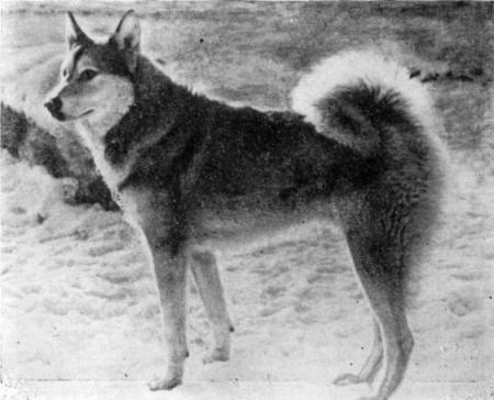Конституция сухая — крепкая. Тип высшей нервной деятельности уравновешенный — подвижный. Высота в холке и в крестце: у кобелей 45–55 см, у сук 40–50 см. Индекс растянутости 100. Аллюр — быстрый и легкий галоп. Костяк легкий. Мускулатура хорошо развитая, крепкая, плотная. Кожа эластичная, без складок и отвислостей. Шерсть длинная, густая, с сильно развитым подшерстком. Волос прямой, довольно грубый и крепкий. Хорошо развит украшающий волос, образующий гриву и воротник на шее, очесы на щеках, штаны на ногах и сильную опушку из длинных волос на нижней стороне хвоста. Длина волос: остевого — 8–9 см, украшающего на шее — 13–14 см, на хвосте — до 20–25 см. Масть разнообразная: белая, черная, рыжая, зонарносерая разных оттенков, пятнистая и пегая. Голова относительно широкая в черепной части. Лоб выпуклый с резко обозначенным переходом к морде. Морда короткая, массивная, заостренная, Мочка носа крупная, черная у темноокрашенных собак и серая или коричневая у белых и светлых. Губы сухие, плотно прилегающие. Уши небольшие, стоячие, высоко поставленные, широкие у основания, с тупыми концами. Глаза небольшие, круглые. Зубы крупные, белые, прикус ножницеобразный. Шея сухая, поставлена высоко. Грудь овальной формы. Холка скрыта длинной шерстью, малозаметная. Спина крепкая, широкая, прямая. Поясница короткая, широкая, немного выпуклая. Круп широкий, короткий, горизонтально поставленный. Живот подтянут немного выше линии груди. Углы плече-лопаточных сочленений 90–100°. Предплечья недлинные, прямые, параллельно поставленные, кажутся толстыми из-за длинной и густой шерсти. Запястье широкое и крепкое. Пясти широкие, почти отвесно поставленные. Задние конечности (при осмотре сзади) прямые и параллельные. Бедра крепкие, мускулистые. Голени короткие, скакательные суставы сухие и крепкие, несколько выпрямленные. Лапы крепкие, круглые, сжатые в комок. Прибылые пальцы встречаются часто. Хвост по длине доходит до скакательного сустава, свернут в кольцо на спине.Северо-восточная ездовая лайка (рис. 17). Ездовые собаки распространены в СССР в бассейне Нижнего Амура, на Сахалине, на побережье Охотского моря, Камчатке, по всему побережью Берингова моря, Якутской АССР, на Чукотском полуострове, в низовьях Таза и Енисея.
