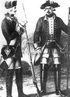 Обер-офицер и рядовой 1-го гренадерского полка. Офицер вооружен укороченным ружьем — обычная ситуация в период военных кампаний, когда стремились повысить огневую мощь боевых линий. После Семилетней войны эта практика сменилась суворовским штыковым ударом. С литографии XIX в. (Русский музей, Санкт-Петербург)