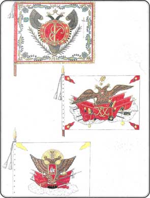 Каждому из гренадерских полков было положено по четыре знамени, одно белое и остальные красные. На всех этих знаменах имелось особое изображение двуглавого орла над арматурой из символов гренадерских полков; орел увенчивался белым облаком. На груди орла изображался московский герб. Полковое (белое) знамя украшалось по углам красными «фламами», цветные знамена — белыми.