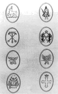 Полковые гербы русских полков. Слева направо, 1-й ряд: Выборгский, Вятский полки. 2-й ряд: Ингерманландский, Казанский полки. 3-й ряд: Кексгольмский, Киевский полки. 4-й ряд: Копорский, Ладожский полки.