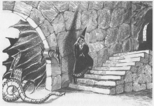 Крылья Рангарига с шумом сложились и золотые пластинки на его боках зазвенели, когда Фемистокл кряхтя слез с драконьей спины. Одна из чешуек, оторвавшись, с громким звоном полетела на пол. — Ой, — сказал Фемистокл, — какой я неловкий. Извини. — Не твоя вина, — отозвался дракон. Он вздохнул. — В последнее время, к сожалению, это со мной часто случается. Чешуя выпадает. Фемистокл тоже вздохнул. Да, начало путешествия не слишком хорошее. Выпавшая драконья чешуйка — знак того, что нынче звёзды расположились неблагоприятно. Что ж, он, в конце концов, сам принял предложение стать новым деканом Университета Драгенталь, и они отправились в путь ранним утром, после того как Фемистокл распрощался со всеми своими старыми друзьями. Но путь из Горивинна сюда, в заброшенную долину на краю Теневых гор, был неблизким, даже если лететь на драконе. Ко всему прочему, по мере их приближения к цели портилась погода: вот уже целый час дождь лил как из ведра. Рангаригу он был нипочём: капли просто скатывались с его золотой брони; но, к сожалению, у Фемистокла чешуи не было, и одежда его была не из золота. К тому же он не только промок до нитки, но и промёрз до самых костей. И на душе было ой как скверно. И то, что он увидел, тоже не способствовало улучшению настроения. Дракон приземлился довольно далеко от замка, так как боялся, что сильные потоки воздуха от крыльев могут повредить крышу. Фемистокл поначалу счёл это преувеличением, но теперь, когда увидел сооружение вблизи… Лучшие годы замка Драгенталь были, очевидно, далеко в прошлом. Фемистокл в последний раз был здесь давным-давно — лет сто назад, и уже тогда он знал, что университет магии не в лучшем состоянии. Но сейчас он увидел самые настоящие руины. Шпиль и крыша огромной башни развалились и зубчатая стена выглядела так, будто её обглодал голодный дракон. Горько вздыхая, Фемистокл снова и снова гладил ладонью свою длинную мокрую бороду. — Да это же настоящая катастрофа! — пробормотал он. — А я бы назвал это по-другому: это вызов тебе, — отозвался Рангариг. — Ведь такому признанному волшебнику, как ты, не составит труда снова сделать из этой развалины респектабельное учебное заведение. Дракон отряхнулся, и Фемистокл отступил в сторону, когда на него посыпались брызги. Он собрался было сделать дракону замечание, но вдруг заметил, что в замке что-то происходит. Он увидел, как стали отворяться массивные ворота чёрного дубового дерева. По крайней мере сначала. Но затем одна створка ворот заскрежетала и застопорилась, а другая дрогнула и со страшным грохотом отвалилась. Фемистокл наморщил лоб. — Да, «вызов» довольно серьёзный, — заметил Рангариг. Фемистокл покосился на него, но ничего не сказал и тронулся в путь. Дракон немного погодя последовал за ним. Насколько Рангариг был подвижным и элегантным в воздухе, настолько неуклюжим и неповоротливым он оказался на земле. Собственно, он не шёл следом за волшебником, а, скорее, ковылял, словно хромая такса, — правда, самая большая такса из всех когда-либо существовавших на свете. В полуоткрытых воротах появилась какая-то фигура, на первый взгляд похожая на Фемистокла как две капли воды. Это тоже был старец с длинной белой бородой и усами, и на нём было такое же простое чёрное одеяние и остроконечная шляпа. Но на этом сходство и заканчивалось. Непрестанно потирая кисти ру