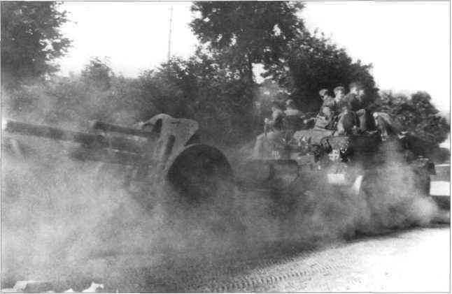 Вот такую пыль поднимали колонны германских войск на Украине в июне и июле 1941 г. Ни снимке — тягач со 105-мм полевой гаубицей на прицепе, дивизия СС «Викинг». Сквозь клубы пыли неплохо просматривается маркировка кормы тягача.