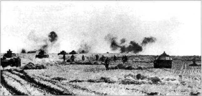 На острие германской военной машины двигались танковые полки. Здесь — штабные танки 2-го батальона. Па заднем плане — горит подбитый советский танк БT-7. Немецкая техника остановилась у околицы горящей русской деревни — дна тапка Pz. Kpfw. III (один из них командирский), бронетранспортёры Sd. Kfz.250 и Sd. Kfz.253. Ни ближайшем танке нанесён бортовой помер «1103» или «1102». Крыши моторных отделений обоих танков --">- 1