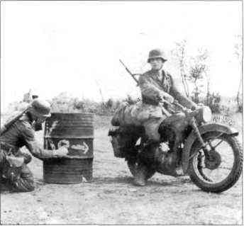 Мотоциклист делает из пустой бочки дорожный указатель. В панцердивизиях и в 1942 г. имелось очень много мотоциклов.