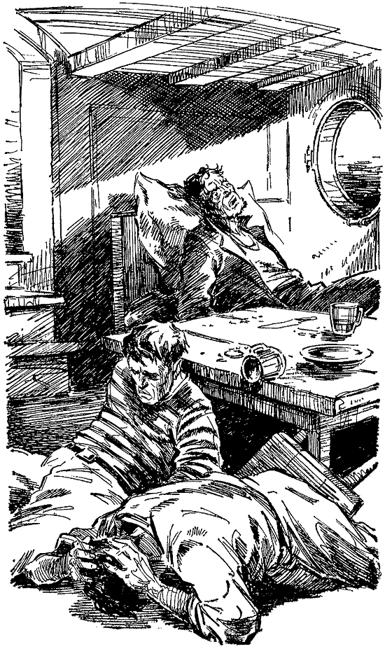 Видимо, все они погибли в одно время. Но от чего? — Отравились, что ли? — Сразу все? Сомнительно. — Мы переговаривались вполголоса. — Да и уж в рыбе-то они разбирались, не стали бы есть опасную. — Не обязательно рыбой. Не одну же рыбу они ели. Вон у них и консервы есть. — Попробуй теперь узнай. В самом деле, в ведре груда немытой посуды. Две тарелки на столе с остатками какой-то еды, давно высохшей. На полу какие-то пятна. Следы рвоты? Но пол такой грязный, что никакая экспертиза, наверное, уже ничего не выяснит. — М-м-может, отравил их какой-нибудь газ, — от волнения начиная, как всегда, немножко заикаться, сказал Олег Никаноренко. — Как экипаж «Уранг Медана». — Ну тот всякие химические вещества вез, а на рыбачьем суденышке откуда ядовитый газ возьмется, — хмуро возразил Волошин. — Какого же черта тот Гартвиг нам баки забивал? — вдруг взорвался Костя Синий. — Не перевертывался катер, целехонек. Может, это он сам их всех отравил? — Кто? — Да Гартвиг же! — А то был вовсе не Гартвиг. Ведь весь экипаж на борту, все шестеро, — сказал Гриша Матвеев. — Настоящий Гартвиг в машинном отделении лежит, возле дизеля. — Точно. А кто же был тот? Мы переглянулись. В самом деле: кто же был человек, спасенный нами неделю назад? Зачем выдавал себя за механика с тунцелова и рассказал сказочку о внезапно налетевшей гигантской волне, якобы потопившей катер, о взрыве и загоревшемся мазуте? И откуда он взялся посреди океана в своей загадочной шлюпке? Зачем поспешно ее затопил? — Чертовщина все же какая-то творится в этой «Пасти дьявола», — упавшим голосом пробормотал Олег Никаноренко. — Может, это был все же Грюн, так его, кажется, называл Казимир Павлович? — нерешительно спросил Гриша. — Ученый-химик? А как он очутился в открытом океане? — И зачем ему было отпираться, врать? Кто мог ответить на эти вопросы? Где теперь было искать мнимого Гартвига? Стараясь не глядеть на трупы, мы обошли весь катер. Суденышко давно не ремонтировалось, было старое, обшарпанное, грязное, но еще вполне пригодное для плаваний. Дизель исправен. Он, видимо, еще долго работал после гибели моториста и остановился сам, когда кончилось горючее, определил Сергей Сергеевич. Девять из двенадцати холодильных цистерн были забиты крупными, как на подбор, тунцами. Видимо, рыбакам посчастливилось напасть на рыбное место, и они, наверное, мечтали скоро вернуться домой сбогатым уловом… Радиопередатчик в рубке был старенький, но вроде тоже исправен. Почему же рыбаки даже не попытались передать сигнал о постигшей их беде? На столе в рубке лежал судовой журнал. Последняя запись была сделана третьего сентября: «Луиза отвернула в сторону. Зыбь с юго-запада шесть баллов. Все в порядке». Значит, они погибли примерно в то же время, когда пропал «Остер». Впрочем, судить об этом было трудно. Записи в журнале велись нерегулярно, от случая к случаю и были весьма, лаконичны. — Сделав последнюю запись, вахтенный пытался потом написать что-то еще. Видите? — сказал Волошин, внимательно изучавший судовой журнал. В садом деле, ниже последней записи, прямо поперек листа было нацарапано, крупными каракулями какое-то слово. Но разобрать его оказалось совершенно невозможно. Мы рассматривали журнал все по очереди и гадали: — Dead? Death?[2] — Первая буква «d», точно. Может, «dagger»?[3] — Здрасьте, я ваша тетя. Какой dagger? Danger.[4] — А может, «dally».[5] Т
