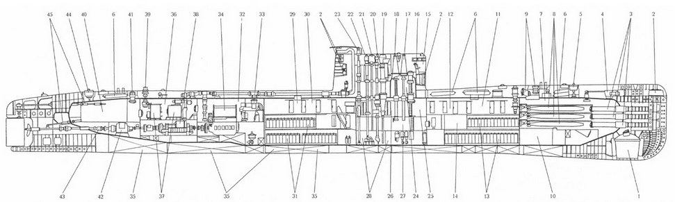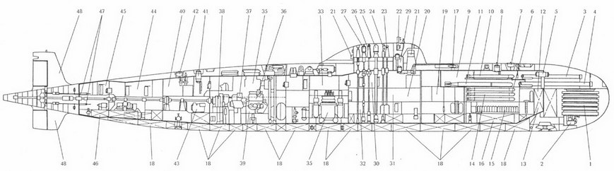 Продольный разрез ПЛА пр. 671РТ: 1 – основная антенна ГАК «Рубин»; 2 – антенна ГАС «Арфа-М» (миноискания); 3 – 533-мм ТА; 4 – 650-мм ТА; 5 – торпедопогрузочный люк; 6 – носовой (торпедный) отсек; 7 ~ носовой аварийный буй; 8 – носовой люк;9 – выгородка запасных торпед и устройства быстрого заряжания; 10 – запасная 533-мм торпеда; 11 – запасная 650-мм торпеда; 12 – цистерна беспузырной торпедной стрельбы; 13 – носовая дифферентная цистерна; 14 – аппаратная выгородка приборов управления ракетоторпедной и торпедной стрельбой «Ладога 1В-671РТ» и ГАК «Рубин»; 15 – АБ, 16 – носовая дифферентная цистерна; 17 – носовой горизонтальный руль с приводами; 18 – ЦГБ; 19 – второй (жилой) отсек; 20 – третий (центрального поста) отсек; 21 – антенны ГАК «Рубин»; 22 – ходовой мостик; 23 – перископ ПЗНГ-10М; 24 – перископ комплекса МТ-70-10; 25 – ПМУ антенны СОРС «Залив-П»; 26 – ПМУ антенны РЛК «Каскад»; 27 – ПМУ антенны радиопеленгатора «Завеса»; 28 – ПМУ антенны «Кипарис» (КСС «Молния»); 29 – прочная рубка; 30 – центральный пост; 31 – выгородки радиоэлектронного вооружения и акустиков; 32 – выгородки вспомогательного оборудования и общесудовых систем (трюмных насосов, насосов общесудовой системы гидравлики, преобразователи и кондиционеры)? 33 – четвертый (реакторный) отсек; 34 – реактор с парогенераторами, циркуляционными насосами и цистернами биологической защиты; 35 – пятый (турбинный) отсек; 36 – паровая турбина; 37 – планетарный редуктор; 38 – главный упорный подшипник; 39 – конденсатор; 40 – шестой (электромеханический и вспомогательного оборудования) отсек; 41 – кормовой люк; 42 – кормовой аварийный буй; 43 – компрессоры системы ВВД; 44 – седьмой (жилой) отсек; 45 – восьмой (ГЭД и рулевых приводов) отсек; 46 – кормовая дифферентная цистерна; 47 – приводы горизонтальных рулей; 48 – вертикальные стабилизаторы.
