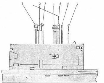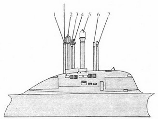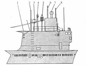 ПЛА пр. 671: I – ПМУ «Ива-МВ»; 2 – ПМУ АН радиопеленгатора «Завеса»; 3 – РКП; 4 – ПМУ АП РЛС «Каскад»; 5 – ПМУ АП СОРС «Залив-П»; (› – перископ «Орион-10»