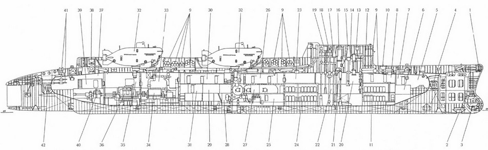 Продольный разрез ПАБСН (сс) пр. 940, 1 – антенна ГАС «Крильон» (бокового и кругового обзора); 2 – антенна ГАС «Гамма-П» (ЗПС); 3 – антенна ГАС«Плутоний» (миноискания); 4 – носовое устройство лагового перемещения; 5 – агрегатная; 6 – аппаратная гидроакустической аппаратуры; 7 – первый (носовой) отсек; 8 – каюта командира корабля и кают-компания офицеров; 9 – баллоны системы ВВД; 10 – носовой аварийный буй; 11 – носовые группы АБ; 12 – ходовой мостик; 13 – репитер гирокомпаса; 14 – прочная рубка; 15 – перископ; 16 – ПМУ устройства РДП; 17 – ПМУ антенны комплекса средств связи; 18 – ПМУ антенны РАС «Каскад»; 19 – ПМУ антенны радиопеленгатора «Завеса»; 20 – второй отсек; 21 – центральный пост; 22 – рубки связи и радиолокации; 23 – третий отсек; 24 – кормовые группы АБ; 25 – четвертый (водолазный) отсек; 26 – каюты водолазов; 27 – специальный водолазный комплекс (поточно-декомпрессионные камеры, отсек длительного пребывания, шлюзовая камера с приемо-выходными отсеками, баллоны с газовыми смесями, гелиево-кислородный компрессор, пост управления работой водолазов, а также водолазного комплекса и т. д.); 28 – гиропост; 29 – пятый (жилой) отсек; 30 – кубрики личного состава; 31 – столовая личного состава и камбуз; 32 – СПА; 33 – шестой (дизельный) отсек; 34 – главный ДД; 35 – седьмой (электродвижения) отсек; 36 – ГГЭД; 37 – восьмой (медицинский или кормовой) отсек; 38 – кормовой аварийный буй; 39 – медицинский блок; 40 – ГЭД экономического хода; 41 – приводы кормовых рулей; 42 – кормовое устройство лагового перемещения.