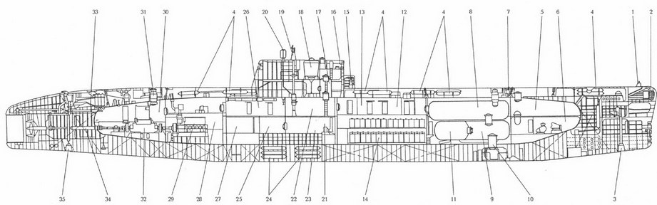 Продольный разрез ПЛА пр. 971: 1 – выгородка основной антенны ГАК «Скат-3»; 2 – проницаемая часть носовой оконечности; 3 – торпедопогрузочный люк; 4 – носовой (торпедный) отсек; 5 – выгородка казенных частей ТА, боезапаса на автоматизированных и дополнительных стеллажах; б – герметичный настил (вторая палуба); 7 – агрегатная выгородка РЭВ (в основном ГАК «Скат-3»); 8 – носовая дифферентная цистерна; 9 – аккумуляторная яма (по бортам от нее находятся цистерны РТК, сама яма и средняя часть второй палубы объединены в амортизированный блок); 10 – второй (центрального поста и жилой) отсек (представляетиз себя единый амортизированный блок); 11 – первая палуба; 12 – вторая палуба; 13 – третья палуба; 14 – четвертая палуба; 15 – центральный пост и выгородка БИУС «Омнибус»; 16 – жилые и медицинские помещения; 17 – выгородки аппаратуры РЭВ, вспомогательного оборудования и общесудовых систем не работающих в малошумном режиме (трюмных насосов, насосов общесудовой системы гидравлики, преобразователи и кондиционеры); 18 – ходовой мостик; 19 – прочная рубка- всплывающая камера; 20 – ограждение прочной рубки; 21 – третий (вспомогательных механизмов, включая все ПМУ) отсек (представляет из себя единый амортизированный блок); 22 – носовой люк; 23 – боевые рубки и агрегатные РЭВ; 24 – выгородки вспомогательного оборудования (включая компрессоры системы ВВД холодильные машины, ДГ, водооотливные и осушительные насосы, преобразователи и т.д.); 25 – четвертый (реакторный) отсек; 26 – аппаратная выгородка (ППУ и баки системы водяной защиты подвешены на консольных балках, заделанных в переборки); 27 – насосная выгородка (вспомогательное оборудование ППУ); 28 – пятый (турбинный) отсек (блок ПТУ через амортизаторы установлен на промежуточной раме, которая по торцам через второй каскад амортизаторов закреплена к межотсечным переборкам); 29 шестой (вспомогательных механизмов) отсек (вторая и третья палубы объединены в единый амортизированный блок); 30 – кормовой люк; 31 – дейдвудная труба; 32 – румпельное отделение (размещаются гидравлические машины, румпели и концы баллеров вертикального руля, больших и малых горизонтальных рулей); 33 – гондола УПВ ГПБА ГАК «Скат-3»; 34 – кормовая дифферентная цистерна.