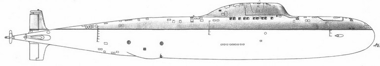 Водоизмещение, т: – надводное 2 300, 2280 [21*] – подводное 3 180 Длина наибольшая, м 81,4, 79,6 [21*] Ширина корпуса наибольшая, м 10,0 Осадка средняя, м 7,6 Архитектурно-конструктивный тип двухкорпусный Глубина погружения, м: – рабочая 320 [22*] – предельная 400 [23*] Автономность, сут 50 Экипаж, чел 32 Энергетическая установка: Главные механизмы: – тип АЭУ – ППУ: – марка… ОК-550, БМ-40А – количество х тип ЯР 1 х РЖМТ – тепловая мощность ЯР, МВт 155 – ПТУ: – тип блочная – марка ОК-7К – количество х мощность ГГЗА, л. с 1 х 40 000 – количество х мощность АТГ, кВт 2 х 1500 – количество х тип движителей 1 х ВФШ Резервные источники энергии: – количество х мощность ДГ, кВт 1 х 500 – аккумуляторная установка: – тип АБ… серебряно-цинковая – количество групп АБ х элементов в группе 1 х 112 – количество х мощность вспомогательных ЭД, кВт 2 х 100 – количество х тип вспомогательных движителей 2 х ВФТ Скорость хода наибольшая, уз: – надводная 14,0 – подводная 41,0 [24*] Вооружение: Торпедное: – количество х калибр ТА, мм 6 х 533 – боезапас (тип) торпед и мин 20 (торпеды САЭТ-60 и СЭТ-65 или 24 мины ПМР-1 и ПМР-2) [25*] – ПУТС «Сарган» Радиоэлектронное: – БИУС «Аккорд» (МВУ-Ш) – НК «Сож» – КСС «Молния» – ГАК «Енисей» (МГК-1001) – РАК «Чибис» – ТК ТВ-1