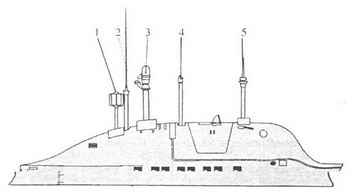 ПЛБСН (л) пр. 1840. I – ЛП радиопеленгатора; 2 – ПМУ ЛИ РАС; 3 – перископ