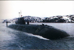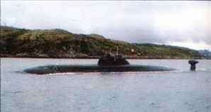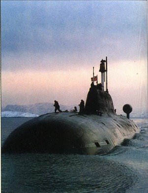 образцов ракет и торпед, совершенной системой целеуказания, а также возможность постройки на ССЗ «Красное Сормово» (г. Горький) и им. Ленинского комсомола (г. Комсомольск- на-Амуре), что накладывало определенные ограничения на водоизмещение лодки. Основу противолодочного вооружения составляет ПАРК «Водопад» (РПК-6), ПЛУР которого моут комплектоваться как специальной боевой частью, так и самонаводящейся малогабаритной торпедой УМГТ-1. ПЛА пр. 945 является двухкорпусной и имеет «лимузинное» ограждение выдвижных устройств и боевой рубки, а также высокое кормовое оперение, на котором расположен обтекатель для буксируемой антенны ГАК. Прочный и легкий корпуса выполнены из титанового сплава. Благодаря этому удалось уменьшить водоизмещение и кардинально решить проблемы коррозионной стойкости и обеспечения магнитной защиты. Прочный корпус в средней части имеет цилиндрическую форму, а в оконечностях – коническую. Он разделен водонепроницаемыми переборками на шесть отсеков. Концевые переборки сферические, а остальные – плоские. Цистерны главного балласта могут продуваться ВВД, а часть из них -при помощи пороховых генераторов. Легкий корпус имеет эллипсоидную носовую и веретенообразную кормовую оконечности. Легкий корпус и наружная поверхность прочного корпуса облицованы резиновым противогидролокационным покрытием. В ограждении выдвижных устройств и боевой рубки размещаются отдельные антенны ГАК и ВСК на весь экипаж. Оно имеет ледовые подкрепления, что позволяет лодке всплывать во льдах. Шпигаты цистерн главного балласта, отверстия и вырезы закрываются щитами. Корабль имеет традиционное двухрядное расположение ТА. В носовом отсеке располагаются стеллажи для хранения боезапаса с устройствами продольной, поперечной подачи и УВЗ. Под ТА находится выгородка с основной антенной ГАК. Реактор ППУ имеет четыре парогенератора, по два циркуляционных насоса для первого и четвертого контуров, три насоса третьего контура. Для снижения уровня физических полей применена двухкаскадная амортизация для всех механизмов и устройств. Все оборудование, действующее в малошумном режиме, установлено на многоярусных амортизированных блоках. По пр. 945 было построено два корабля, которые по внутренним водным путям были переведены в Северодвинск, где их достроили и ввели в строй. По состоянию на декабрь 2001 г. в составе флота находилась одна ПЛА пр. 945. К-239 (зав. № 301, с 03.06.1992 г -Б-239, с 06.04.1993 г-Карп). ССЗ «Красное Сормово» (г. Горький): 20.07.1979 г.; 29.07.1983 г.; 29.09.1984 г. Входила в состав СФ. В декабре 1994 г. на МП «Звездочка» (г. Северодвинск) была поставлена в средний ремонт. 30.05.1998 г. из-за отсутствия финансирования Б-239 исключили из боевого состава флота, передали ОРВИ на долговременное хранение и в порту г. Северодвинска поставили на отстой. К-276 (зав. № 302, с 03.06.1992 Т.-Б-276, с 06.04.1993 г ~Краб, с 1996 v-Кострома). ССЗ «Красное Сормово» (г. Горький): 21.04.1984 г.; 26.07.1986 г.; 27.10.1987 г. Входит в состав СФ. 11.02.1992 г. во время отработки задач боевой подготовки на Кильдинском плесе в подводном положении столкнулась с американской ПЛА Baton Rouge (типа Los Angeles)[29*]. Б-276 получила повреждения легкого корпуса и ограждения выдвижных устройств. С 28.03.12992 г. по 29.06.1993 г. на СРЗ «Нерпа» (пос. Вьюжный) она прошла восстановительный ремонт. В настоящее время находится в губе Ара в ожидании среднего ремонта. 29* Baton Rouge п