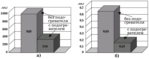 Рис. 1.2. Выбросы в выхлопе автомобиля: а) уровень СО при пуске холодного и прогретого двигателя подогревателем DEFA; б) относительное уменьшение выбросов прогретого двигателя при температуре -20 °C (от компании DEFA).