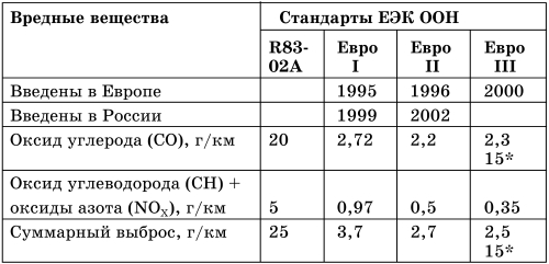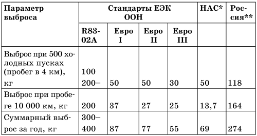 Казалось бы, величина уменьшилась незначительно. Но главное изменение в том, что Евро III уже частично регламентирует величину выбросов при пуске двигателя. Правда, величина выбросов регламентирована для пуска двигателя при температуре -7 °C, что, конечно, не соответствует средней зимней температуре в России. Ну а по сравнению с суммарной нормой в прогретом двигателе в 2,5 г/км норма на пусковые выбросы больше их в 6 раз и составляет 15 г/км. На основании этих данных можно подсчитать средний годовой объем выбросов при условии пробега в 10 000 км и 500 холодных пусков c эквивалентным пробегом 4 км. Как видно из таблиц 1.2 и 1.3, применяя предпусковой подогрев для автомашин с катализатором, можно добиться снижения годовых выбросов до величины 13,7 кг, т. е. в пять раз. Но таких «хороших» машин в сегодняшней России всего 22 %, поэтому для среднестатистического российского автомобиля уменьшение суммарного выброса будет всего в 1,7 раза, что тоже существенно. Применение предпускового подогрева позволяет среднестатистическому автомобилю иметь выбросы намного меньшие, чем это допускают нормы Eвро III. Европа готовится к новым нормам Евро IV, но, судя по всему, нам до них еще далеко.