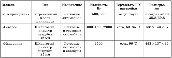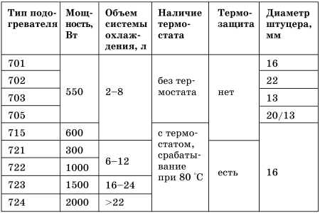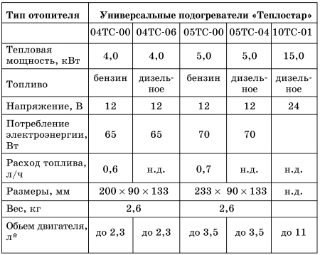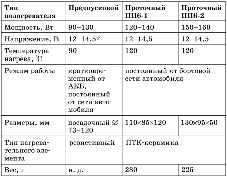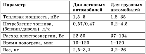 К наиболее важным для пользователя техническим характеристикам относятся отопительная (тепловая) мощность, потребление топлива и расход электроэнергии от аккумулятора. Диапазон типовых их значений приведен в таблице 2.1. Тепловая мощность характеризует тепловую производительность подогревателя, она измеряется в кВт/ч или, реже, ккал/ч, обычно единица времени опускается.Таблица 2.1. Типовые характеристики автономных подогревателей