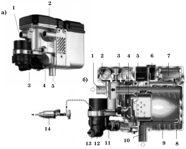 Рис. 2.2. Отопитель Thermo Top С: а) внешний вид: 1 – вход воздуха сгорания, 2 – выход горячей жидкости, 3 – вход холодной жидкости, 4 – подача топлива, 5 – выход отработавших газов; б) устройство: 1 – забор воздуха, 2 – нагнетатель воздуха, 3 – выпускной жидкостной патрубок, 4 – штифт накаливания/ датчик пламени, 5 – испарительная прокладка, 6 – штекеры, 7 – блок управления с датчиками температуры, 8 – теплообменник, 9 – камера сгорания, 10 – выход отработавших газов, 11 – забор топлива, 12 – циркуляционный насос, 13 – заборный жидкостный патрубок, 14 – топливный дозирующий насос (от компании «Вебасто Рус»).