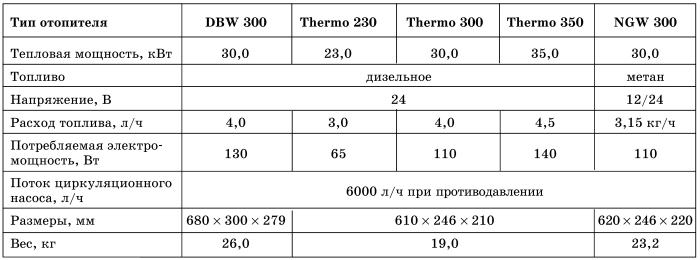 Таблица 2.3. Характеристики отопителей Webasto для грузовых автомобилей