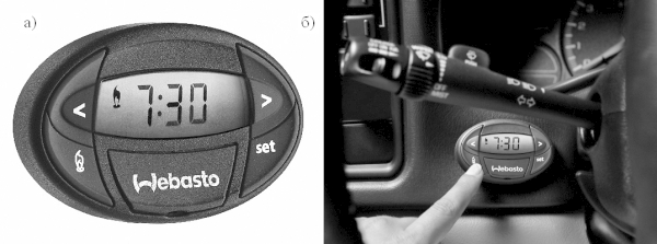 Рис. 2.3. Таймер отопителя Thermo Top: а) общий вид; б) таймер в автомобиле (от компании «Вебасто Рус»).