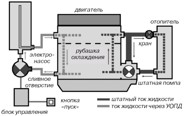 В основе работы неавтономных подогревателей лежат два хорошо известных физических явления: подогрев с помощью электрической энергии и теплообмен в жидкой среде, называемый конвекцией. Хотя оба явления известны, но использование конвекции в подогревателях имеет дополнительную особенность. Главное, что конвекция охлаждающей жидкости происходит в замкнутом объеме и тесном пространстве системы охлаждения двигателя с установленным в ней подогревательным элементом. Нагретая жидкость расширяется, ее плотность (и вес) становится меньше. В результате нагретая жидкость перемещается вверх относительно более холодной ее части. Конвекция приводит к выравниванию температуры жидкости, а при постоянном подводе теплоты от подогревателя в системе охлаждения возникают стационарные конвекционные потоки, или, иными словами, имеет место термосифонная циркуляция жидкости. Чтобы подогрев двигателя был эффективным, необходима интенсивная конвекция. При встраивании подогревателя в блок цилиндров двигателя управлять конвекцией при установке, естественно, невозможно. Для получения эффективного подогрева установщики и пользователи систем подогрева следуют рекомендациям их изготовителей, которые выбирают и опытным путем находят наиболее подходящие места установки подогревателей. При использовании подогревателей, подключаемых к системе охлаждения с помощью шлангов, картина несколько иная. Эффективность конвекции и, следовательно, подогрева в большей степени зависит от длины и мест подсоединения шлангов, а также от конфигурации их прокладки. Т. е. степень конвекции зависит от технологии установки. Установка шланговых подогревателей не столь однозначна по сравнению со встраиваемыми в блок двигателей подогревателями. Более того, в российских условиях часто используют шланговые подогреватели, когда в наличии нет апробированного изготовителем типа подогревателя. Для этого случая инструкция по установке изготовителем не разработана и приходится использовать общие рекомендации фирм-изготовителей по установке систем подогрева со шланговыми подогревателями. И все же иногда выполнить полностью приведенные рекомендации не удается, что приводит к слабому подогреву двигателя. Каков же выход? На «выручку» приходит система подогрева, в которой используется принудительная конвекция жидкости, достигаемая ее прокачкой специальным электронасосом. Такие системы подогрева весьма эффективны, и, несмотря на дополнительные затраты, они начали широко применяться на практике. В системах подогрева со шланговыми подогревателями иногда применяется гидравлический элемент, называемый обратным клапаном. По сути это мембрана (лепесток или шарик), которая под действием гидравлического напора (или разряжения) жидкости отодвигается и обеспечивает проход жидкости в нужном направлении. Такой клапан может встраиваться в канал подогревателя или врезаться прямо в шланг. Как известно, входной и выходной шланги подогревателя прокладываются с подъемом вверх. При неправильном или неудачном расположении шлангов нагретая подогревателем жидкость может пойти в обратном направлении через входной подводящий шланг, а не через выходной, и нужной циркуляции жидкости не будет. Тогда из-за ее отсутствия подогрев двигателя осуществляться тоже не будет. На п