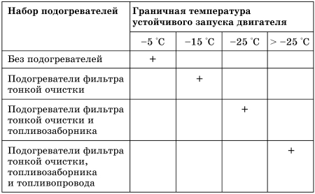 Система подогрева топлива обеспечивает: • автоматическое включение подогрева при понижении температуры окружающей среды ниже +3–5 °C; • автоматическое выключение подогрева при повышении температуры окружающей среды выше +3–5 °C; • оперативное управление подогревателями по предусмотренной программе, с изменением времени и режима подогрева в зависимости от температуры топлива; • последовательное включение подогревателей системы; • отключение системы при падении напряжения в бортовой сети автомобиля ниже порогового уровня или снижении уровня топлива в баке ниже нагревателя топливозаборника.
