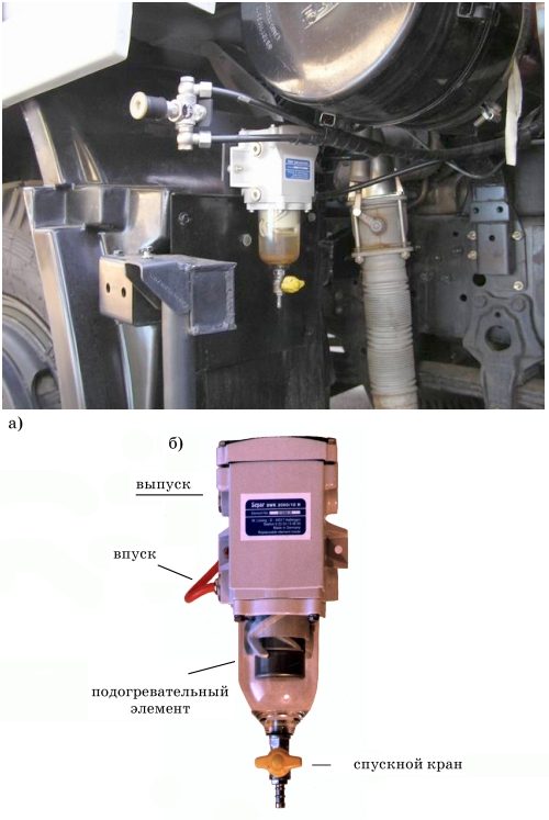 Оно заключается в очистке отстойника и замене фильтрующего элемента. При сливе воды и загрязнений из отстойника происходит эффективное самоочищение фильтрующего элемента. Как правило, фильтр может использоваться без замены в течение 10–15 сливов. Перед очисткой фильтра заглушите двигатель. Выверните болт разгерметизации на крышке фильтра. Откройте спускной кран. Чистое топливо, находящееся над фильтрующим элементом в верхней части фильтра, опустится обратно вниз и промоет элемент от капель воды и частичек грязи. Необходимо производить слив из фильтра до полного вымывания грязи из фильтра. После этого закройте кран и, в случае необходимости, сняв крышку, наполните фильтр топливом для удаления воздуха из топливной системы. Заверните болт разгерметизации и пустите двигатель. Если ощущается потеря мощности, замените фильтрующий элемент. В любом случае фильтрующий элемент требуется менять не реже 1 раза в год.Подогреватели топливозаборника