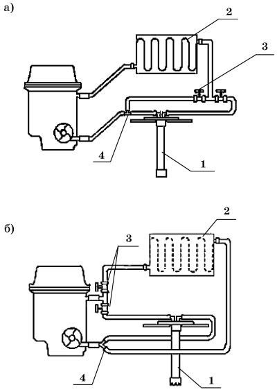 Рис. 6.9. Схема установки топливозаборника: а) последовательно с радиатором отопителя; б) параллельно с радиатором отопителя кабины: 1– топливозаборник; 2 – радиатор двигателя; 3 – краны; 4 – тройник (от компании «Номакон»).