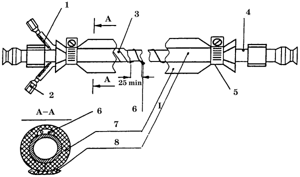 Рис. 6.11. Топливопровод компании «Ивэль»: 1 – провод электропитания, 2 – клеммный зажим, 3 – самоклеющаяся стеклолента, 4 – топливопровод, 5 – стяжной хомут, 6 – нагревательный элемент, 7 – теплоизоляцуия «Армафлекс», 8 – самоклеющаяся лента.