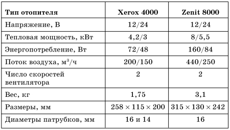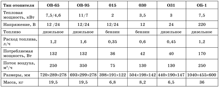 Таблица 2.6. Характеристики отопителей компании «Элтра-Термо»
