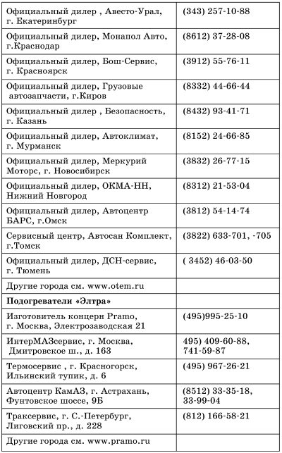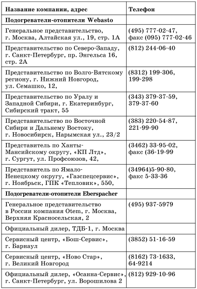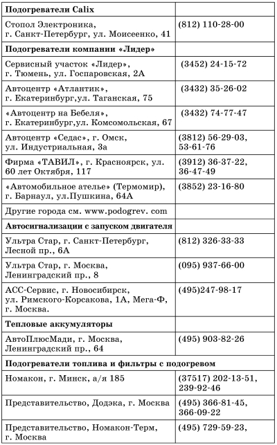 Главные устройства, которые рассматриваются в этом справочнике, относятся к системам предпускового подогрева двигателей и обогрева салона. Отдельную категорию устройств, которые мы также представили ниже, составляют воздушные отопители кабин, салона и грузовых отсеков. К комплексу средств, предназначенных для обеспечения надежной работы дизельных двигателей, относятся подогреватели дизельного топлива. В системах предпускового подогрева и обогрева по своей распространенности выделяются жидкостные отопители-подогреватели, которые одновременно выполняют функции и подогрева двигателя, и обогрева салона. Они относятся к категории автономных (независимых) систем. Автономные системы для подогрева двигателя и салона используют тепловую энергию, образующуюся от сжигания топлива, на котором работает двигатель автомобиля. Соответственно они подразделяются на бензиновые и дизельные. В качестве теплоносителя в автономных системах используется жидкость автомобильной системы охлаждения двигателя. Поэтому часто автономные системы называют жидкостными отопителями. Подогрев двигателя в неавтономных системах производится с помощью электрических подогревателей, работающих от бытовой электросети. Теплоносителем большинства неавтономных систем также является охлаждающая жидкость. Менее распространены неавтономные системы, осуществляющие подогрев непосредственным контактом подогревателя с рубашкой или поддоном двигателя (см. главу 3). В специальную группу систем подогрева мы включили автосигнализации с дистанционным запуском двигателя и тепловые аккумуляторы. Используя периодически дистанционный запуск двигателя, предусмотренный в автосигнализациях, удается поддерживать температуру двигателя таким образом, чтобы следующий его запуск был «легким» и безотказным (глава 4). В тепловых аккумуляторах, представляющих своеобразный термос, сохраняется нагретая охлаждающая жидкость, которая при очередном запуске двигателя циркулирует в его системе охлаждения. В результате ее циркуляции двигатель подогревается (глава 5). Воздушные отопители представляют отдельный класс устройств, предназначенных для обогрева салона и отсеков легковых, грузовых автомобилей и микроавтобусов. Подогрев двигателя они не производят. Они также подразделяются на автономные и зависимые. В отопителях первого вида нагрев воздуха салона происходит за счет тепла, выделяемого в отопителе при сгорании топлива. Для этого питание воздушных отопителей производится от топливной системы автомобиля или от специального бака. В зависимых воздушных отопителях нагрев воздуха производится с помощью теплообменника (радиатора), через который проходит охлаждающая двигатель жидкость. Теплообменник продувается воздухом от встроенного вентилятора, запитанного от бортовой сети автомобиля. Подогреватели сидений являются дополнительным оборудованием автомобиля и осуществляют подогрев сидений с помощью бортовой электросети автомобиля. В специальной комплектации с неавтономными системами подогрев сидений можно осуществить и от внешней электросети одновременно с подогревом двигателя (глава 8). К последней группе устройств отнесены подогреватели топлива, сконструированные в виде подогреваемых топливозаборников или насадок на топливопроводы (см. гла