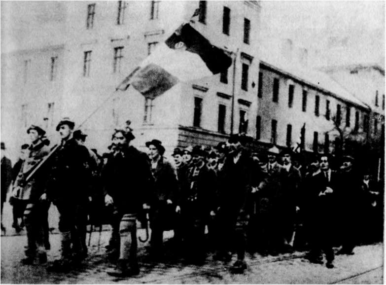 Колонна демонстрантов — мюнхенских рабочих и красногвардейцев — на Людвигштрассе во время Баварской Советской республики.