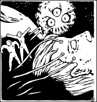 Мужчина повернул голову к женщине ровно на столько, на сколько смог, ему мешали почти вывернутые суставы рук и плечей, каждое малейшее движение приносило острую боль. — Не бойся, — проговорил он, еле шевеля пересохшими губами, — это или дурацкий розыгрыш или какое-то недоразумение. Скоро все это кончится и мы вместе посмеемся! А я еще и врежу пару разиков этим зарвавшимся комедиантам! Не бойся! Он старался, чтобы голос звучал уверенно. Но он знал, его слова обычная утешительная ложь. И она знала об этом. Знала и молчала. Шестиногие полумеханические твари сновали рядом, все что-то подправляли, переделывали, что-то замеряли с таким деловым видом, будто это не они прикрутили их с поистине бесчеловечной жестокостью к поручням внешней смотровой площадки. Ни один робот или кибер на свете не имел права, да и просто не мог так вести себя по отношению к человеку, он бы тут же самоотключился, утратил способность двигаться и вообще что-то делать! А эти прикручивали их к железякам, будто имели дело с куклами или мешками с опилками. Нет, розыгрышем здесь и не пахло. — Они там, с ним, — проговорила она. И, ее голос по внутренней связи прозвучал в его шлемофоне сдавленно, неестественно. — Понимаешь, он там, с ними! — Его они не тронут, успокойся. Даже дикие звери, на Земле или на любой другой планете, сама знаешь, не трогают детей! — Эти совсем другие, они хуже зверей! Они нелюди! — Не надо делать преждевременных выводов. — Смотри! Не-е-ет!!! Он оглох от ее крика. Но еле удержался сам. То, что они видели, было невыносимым зрелищем. Один за другим из рубки корабля выбрались в Пространство три коренастые фигуры без шлемов, да и без самих скафандров, в одних сероватых, перехваченных ремнями комбинезонах с короткими рукавами и штанинами, открывавшими чешуйчатое тело, какие-то наросты, когти… Головы выбравшихся наружу были усеяны темными словно бы шевелящимися пластинами, их лица были неописуемо ужасными — трехглазыми, с широкими растянутыми по всей плоскости лица носами, имеющими по четыре подрагивающих рваных отверстия. Сплюснутые подбородки и брыластые обвисающие многослойные щеки были усеяны отвратительными бородавками и густыми пучками щетинистых черных волос. Загримироваться так было просто невозможно! Даже вообразить себе такую маску, а тем более сотворить ее, тоже было нельзя! Но не это вырвало крики из горла женщины и сдавило сердце мужчины. Нет, совсем другое! У последнего из вылезших был зажат в жуткой, когтистой лапе с множеством корявых изогнутых пальцев-крючьев их малыш! И на нем не было ничего!!! Мужчина рванулся что было силы. Но лишь потерял зрение из-за страшной боли в вывернутых суставах, глаза словно расплавленным металлом залило. Крик в его ушах не смолкал. Когда зрение вернулось, он увидел, что ребенок цел и невредим, что его не разорвало в клочья внутренним давлением, что он не задохнулся в пустоте, не превратился в кусок льда… Он был жив, шевелил ручками и ножками, таращил на них большие серые глазенки. — Вот видишь, — сказал он женщине, — они не делают ему зла, они все понимают, у них есть какое-то силовое поле, предохраняющее от всех этих дел. — Неважно, что у них есть! Главное, он жив! Видишь, он махнул мне ручкой, высунул язычок, он зовет нас к себе, видишь? Мужчина все видел. Но он видел и другое — киберы подогнали к чешуйчатым катерок, развер