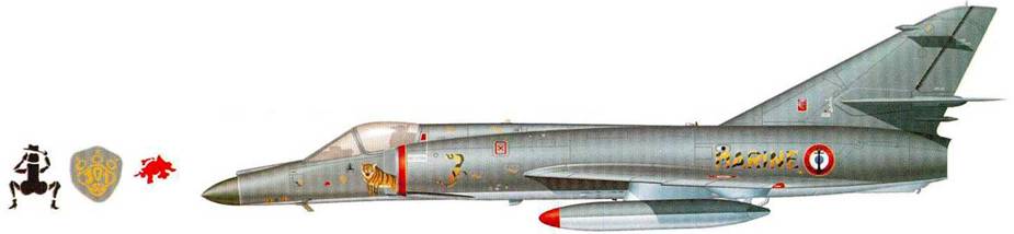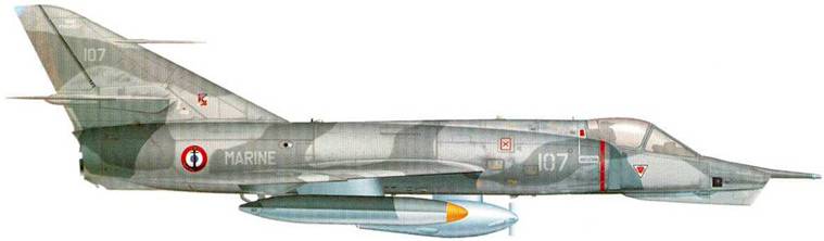 «Супер-Этандар» «серая«3» из 11-й флотилии. Принимал участие в операции «Бальбюсар» в качестве самолета-заправщика, обеспечивая вылеты фоторазведчиков. Обратите внимание на приглушенные тона опознавательных знаков, эмблемы и технадписей.
