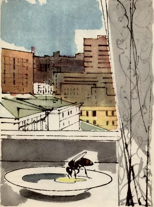 Что-то влетело в форточку и стукнулось об пол. Я подумала: это бросили камешек. Нагнулась и увидела пчелу. Пчела была как неживая, и только крылья у неё дрожали. Я оставила пчелу там, где она упала, и забыла про неё. А вспомнила на следующий день, когда пчела зашуршала возле окна. Потом я обнаружила пчелу у себя на кровати. Пчела ползала по одеялу и усиками ощупывала ворс. Усики у неё были похожи на ноги, и она ими переступала с одного места на другое. «Укусит — окривеешь », — предупредила меня мама. Но «окриветь» я не боялась. Пчела была будто не пчела. И будто всё время знала, что вот я рядом. И что живём мы с ней вместе в этой моей маленькой комнатке. Я живу, потому что это моя комната, а она, потому что прилетела ко мне и хочет со мной жить. Хочет вот так ползать и одним глазом на меня смотреть. Тут предложили мне ёжика. Поймали ёжика возле метро — он улицу переходил. Ёжик, говорят, домашний— людей не боится. Но я отказалась от ёжика. Зачем мне ёжик, когда у меня есть пчела. А пчела то пошуршит возле окна, то за шкафом, то придёт ко мне. И ползает рядом. Пчела по полу «ходит», вроде как я, словно уверена, что никто её не тронет. Я-то хожу осторожно — под ноги смотрю, но вот гости... И тогда я решила мою пчелу в ящик спрятать. Не насовсем, конечно, а пока гости будут. Ящик у меня был от яблок. И дырки там были большие. Я стала думать, как эти дырки закрыть, чтобы пчела через них не выползла. А мама тем временем мне и говорит: «Накормила бы пчелу. Мёд у нас есть». Мне это и в голову не пришло, что пчелу надо кормить. Ну ёжика, того кормят, птичек кормят, рыбок... Ну собак, конечно. Но пчелу... Вроде сама она залетела. Сама тут ползает, вроде бы сама и еду себе должна найти. Не кормлю же я мух. Но маме моей обязательно надо всех накормить. Вот и пчеле она несёт блюдечко с мёдом. А пчела, хоть и сидит на краешке блюдца, но мёда будто и не видит и запаха его не чувствует. Тогда я капельку мёда кладу совсем рядом с пчелой. У самого её усика. И пчела нехотя эту капельку начинает слизывать. Но так безразлично она это делает, словно моё одеяло облизывает. Однако ползёт дальше, и доползает до мёда, и начинает его пить. Тут я мою пчелу вместе с блюдечком ставлю на окно и отхожу. Дела у меня свои.