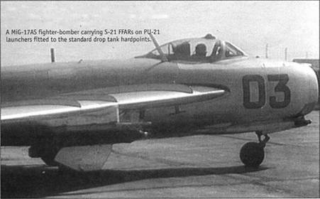 Истребитель МиГ-17АС с реактивными снарядами С-21 на пусковых установках ПУ-21, смонтированных на штатных замках подвесных топливных баков.