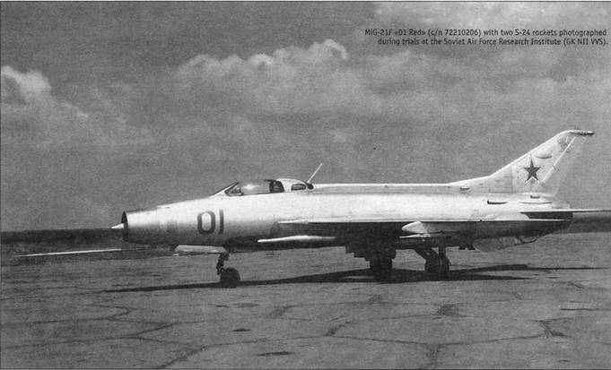 Истребитель МиГ-21Ф (борт 01-красный, зав. №72210206) с двумя реактивными снарядами С-24 на испытаниях в ГК НИИ ВВС.