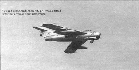 Истребитель МиГ-17 поздних серий с четырьмя внешними узлами подвески вооружения.
