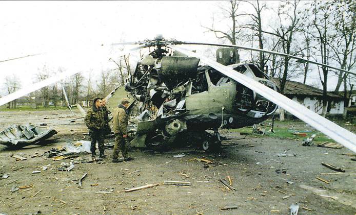 Солдаты федеральных войск осматривают останки дудаевских Ан-2 и Ми-8, уничтоженных ракетными ударами российской авиации на аэродроме ДОСААФ, г. Грозный. Снимки сделаны 2-4 апреля 1995 г. (Фото Александра Ефремова).