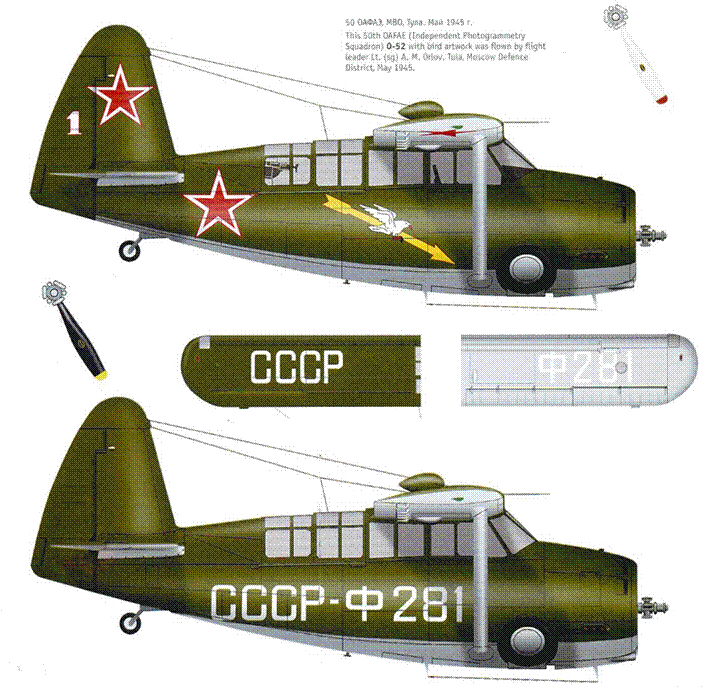 В 22-м зап самолеты продолжали летать без опознавательных знаков, в том числе и советских. Лишь в мае 1942 г. командир вновь созданной б-й заб (запасная авиабригада) запретил выпускать в воздух машины без красных звезд. Номера наносились мелом на киле или руле поворота. Известны O-52 с номерами «2» и «3». В 13-й окаэ звезды с белой окантовкой располагались на фюзеляже и с черной – на самом конце крыльев снизу. В 42-й окаэ – звезды без окантовок на киле и, вероятно, снизу на крыле; присутствие их на фюзеляже на фотоснимке не заметно. В 5-й оафаэ -звезды с красно-белой окантовкой на фюзеляже, киле и снизу на крыле. На снимке самолета, разбитого старшим лейтенантом Орловым в аэрофотосъемочной эскадрилье, можно увидеть уже не только звезды и номера, но и птичку на борту. Была ли это эмблема 5-й оафаэ, прихоть Орлова или просто шутка механика, и реальные цвета пернатого-тайна, которая, вероятно, никогда не будет раскрыта, и мы не настаиваем на предложенном вам цветовом решении. «Кертис», принадлежавший тресту «Аэрогеология» в начале 50-х годов нес гражданские обозначения СССР-Ф281 на обоих бортах фюзеляжа; СССР – сверху на левом и снизу на правом крыле; Ф281 – сверху на правом и снизу на левом крыле. На фотографии, вроде бы, различим камуфляж, но плохо, и условно будем считать самолет оливковым. Пропеллер был окрашен в серебристый цвет с эмблемой фирмы-изготовителя на лопастях (у СССР-Ф281 лопасти черные с желтыми законцовками). В литературе не удалось найти информацию об окраске интерьера кабины и шахт шасси, но по воспоминаниям А. С. Шевчука, все они были окрашены серебрянкой. Приборные доски – черные. Стойки шасси – серебрянка, видимые элементы гидравлики – полированная сталь. Крыльевые подкосы и диски колес – серые. Сверху у корня закрылков – белые таблички с красной надписью «No step» («Не наступать»). Зимние лобовые щиты на капотах O-52 в 42-й окаэ, вероятно, зеленые (краска А-24м). Не исключены аэролак АМТ-4 того же цвета или другие защитные краски и лаки. Авторы выражают благодарность ветерану 42-й окаэ А. С. Шевчуку, поделившемуся фронтовыми воспоминаниями и предоставившему фотографии для публикации, и сотрудникам ЦАМО РФ и РГАЭ, оказавшим большую помощь в работе. При подготовке статьи были использованы следующие материалы ЦАМО РФ: Фонд 3 BA on. 4493 д. 10, on. 4495, д. 32, 33. 165, 168, 215,216, 241, 244, on. 4498 д. 17,18, on. 4510 д. 12,15, on. 4511 д. 1; Фонд 7 BA on. 5440 д. 3, 5; Фонд 13 BA оп. 6169, д. 3, 31, 32, 50, 56, on. 6173 д. 7; Фонд 6 ЗАБ on. 1 д.д. 9,10, 41, 72, on. 2 д. 28,30; Фонд 22 ЗАП on. 159869, д. 1, оп. 159870 д. 1, оп. 159872, д. 2, on. 159976, д. 5; Фонд 203 ОКРАП оп. 211995, д. 1, 4, 6, on. 517480, д. 1; Фонд 5 ОАФАЭ on. 268852, д.д. 1, 2,4, 5, оп. 268853, д. 1, 3, on. 268854, д. 2, оп. 752808, д. 1, on. 752807, д. 1; Фонд 55 САМ оп. 920209, д. 2; Фонд НИИ ВВС оп. 485655, д. 298.