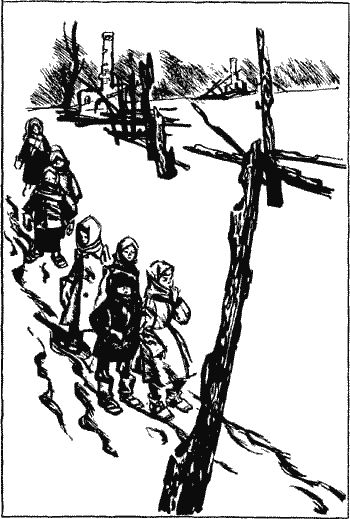 Груня вышла на улицу. Улицу намечали только деревья, растущие вдоль дороги, да кусты палисадника. Но ни одной избы не было на посаде. Лишь печные трубы торчали над темными грудами кирпича и глины. Странный, сиротливый вид был у этих труб, словно зябли они под дождем и ветром, потому что привыкли стоять под крышей, в теплой избе… Домов нет. Можно подумать, что и людей здесь нет. Но это посторонний человек мог так подумать. А Груня знала, что весь колхоз Городище здесь и ни одна колхозная семья не покинула свою землю. Груня стояла, жмурясь от ветра, и раздумывала, в какую сторону ей пойти сначала. В ригу, что стоит на задворках возле самого поля? Или спуститься к реке, в кузню? Или забежать в соломенный шалаш, который притулился под елками? «Побегу за Стенькой, — решила Груня, — а потом с ней вместе — за другими». Но зашевелилась в шалаше соломенная дверь, приоткрылась немного, и сама Стенька вылезла на улицу. Концы большого серого платка торчали у нее на спине, а из коротких рукавов высовывались покрасневшие руки. — Стенька, ты куда? — К тебе! — А я к тебе! Стенька мелкими быстрыми шагами подбежала к Груне. Ее смешливые серо-голубые глаза блестели и радовались неизвестно чему. — Руки-то хоть в карманы спрячь, — поежившись, сказала Груня, — на тебя глядеть-то холодно! — Тебе холодно, а мне нет, — ответила Стенька и пошевелила растопыренными пальцами. — Зима, что ли! — Знаешь, что я тебе скажу… — начала было Груня. Но Стенька перебила: — Нет, что я скажу! Наш Трофим все выскакивает на улицу босиком — возьмет и пробежит прямо по снегу. Мать нашлепает, а он опять! А дедушка Мирон Телегин взял да ему свои сапоги отдал! Новые! Нигде не худые! Говорит — пусть бегает, ему хочется побегать. А я, говорит, уж старый. Трофим-то маленький, а сапоги — во какие! Чудно до чего! А Трофиму — хоть бы что! — Да подожди ты!.. Как сорока!.. — крикнула на нее Груня. — «Трофим, Трофим»! — А ты не кричи! Не больно я тебя боюсь! Груня вспомнила наказ, который ей давала мать, и сказала тихо: — Я не кричу. Это я так. Нам с тобой одно дело есть… Груня подумала, что Стенька как узнает, какое это дело, так сейчас удерет да и забьется опять в свой шалаш. Поэтому она объяснила как можно мягче: — Ведь до шоссе недалеко… Да можно и не помногу. Ну, хоть сколько-нибудь принесем — и то польза! Но Стенька и не собиралась отказываться. Наоборот, она обрадовалась, будто ее позвали на праздник: — На шоссе всей гурьбой — вот весело! Пойду скорей у мамки мешок попрошу! Если бы Груня знала, как надоело Стеньке сидеть в соломенном шалаше, в духоте, в тесноте, среди вздохов и невеселых разговоров! Там одна бабка Вера доймет — как начнет вспоминать немцев, как начнет их ругать да проклинать, а у самой так лицо и дрожит и губы дрожат… А что они — слышат, что ли? Их уж вон как погнали — из Ржева выбили и дальше гонят. — Пойдем сначала Ромашку позовем, — живо сказала Стенька. — И Федя там. — А Раису? — И Раису позовем. А что — барыня, что ли? С Ромашкой они сразу поссорились. Когда девочки прибежали к риге, Ромашка прибивал над дверцей риги отставшую доску. Стенька подскочила к нему: — Ромашка! Бросай сейчас же! За картошкой идем! Ромашка приподнял свою лобастую голову и, не выпуская молотка, отпихнул на затылок пилотку. Он глядел спокойно, слегка снисходительно, и крупный рот его не спешил улыбаться. — Идете, так и идите, а 