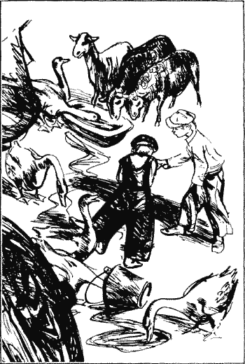 А Федя уже давно мчался по склону горы, перескакивал с тропки на тропку и воображал, будто скачет на сером Соколике, на лучшем колхозном коне. Федя погонял коня, торопился. Ему надо было скорей попасть на птицеферму, там, может быть, уже все клушки с цыплятами ходят. Мать еще с вечера ушла туда, на ферме и ночевала сегодня. Когда начинают выводиться цыплята, тут особенно надо следить за ними. Крепкие Федины ноги с короткими пальцами и загрубевшими пятками так и мелькали по тропке. Иногда Федя натыкался на колючие кустики, которые всюду, словно ежи, сидели по горам, и высоко подпрыгивал от боли. Но не останавливался, а мчался дальше. За двугорбой горой Федя спустился вниз. Солнце было невысоко, и длинные лучи сбоку, с моря, освещали узкую зеленую долину. На траве, на цветах, на молодых зеленых колючках дикого перца, на пушистых кустиках полыни — всюду дрожала и блестела роса. Щебетали стрижи и ласточки, пели во весь голос черные дрозды. Они недавно прилетели из-за моря и теперь отдыхали здесь в долинах. От птичьих песен просто звон стоял! Земля в долине была изрезана глубокими трещинами. Это вешняя вода с гор каждый год роет и углубляет их. Они такие глубокие, что если взрослый человек идет по дну, то его совсем не видно. Колхозный агроном называет эти трещины каньонами. В одном, самом глубоком каньоне колхозники заперли воду плотиной. И в долине теперь появилась полная до краев река. Только не было волны в этой реке, и течения не было. А вода стояла светлая и зеленая — светлая от солнца, а зеленая оттого, что в ней, как в чистом зеркале, отражались зеленые крутые берега. Федя, твердо ступая крепкими пятками, прошелся по плотине. Вот это запруда! Вон сколько земли насыпано, да еще камнем забито. Ну что ж, надо коров, лошадей поить. Овец вон огромные стада по горам пасутся — им тоже пить надо. А птицеферма? Тут и гуси и утки — всем вода нужна. В море-то не больно напьешься. Федя посмотрел туда, где за увалами шумело море. Оно было темное сегодня, волны с белыми гребешками бежали к берегу откуда-то из далекой дали… Что-то тревожное почудилось Феде в этом шуме волн, море будто сердилось и грозило кому-то… Но Федя тряхнул головой и снова весело запрыгал по плотине. Вон уже и ферма показалась на горе, на той стороне долины. Длинный, низкий дом, множество маленьких окошек, и в каждом из них — пучок солнечных лучей. А вокруг этого дома на зеленой траве будто снег выпал — белые куры и гуси. Вот отошла в сторонку стая гусей, поднялась в воздух, зашумела крыльями, пролетела над долиной и плавно опустилась на воду. Вот уже и плывут белые гуси по тихой воде, разбивают ее в мелкую зыбь. А зыбь эта и зеленая от берегов, и золотая от солнца. — Здорово летают, — одобрительно сказал Федя. Если бы Федя перешел плотину и поднялся по белой дороге наверх, на горную гряду, он бы скоро попал на птицеферму. Но ему очень понравилось глядеть на гусей, которые плавали и плескались в запруде, и он шел по берегу тихой воды все дальше и дальше в цветущую долину. Вдруг Федя заметил, что зыбь на воде сразу погасла — и зеленая и золотая. Мрачная, темная стала вода. И тут же умолкли птицы, долина потемнела. Далекий гул прозвучал в горах. «Гром, что ли?» — подумал Федя. И оглянулся назад, на Большую гору. А Большую уже и не видно было, черные тучи закрывали ее всю, и белые молнии сверкали в них. Федя мигом