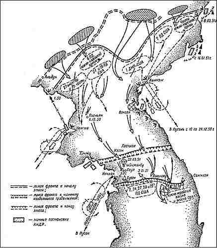 Фронтальное наступление обеспечивало китайцам успех при проведении большого количества атак малыми силами. Наиболее часто китайские добровольцы использовали просачивание, засады и окружение, с расчетом углубиться на большое расстояние. Каждый бой начинался серией мелких стычек малыми силами. Это была война взводных командиров. Американцы так и не смогли полностью реализовать своего преимущества в огневых средствах. В ходе первой фазы зимнего наступления «северян» «южане» потеряли 36 тыс. солдат и офицеров, из них более 24 тыс. американцев. Наступление 400 тыс. китайских добровольцев и 100 тыс. бойцов северокорейской армии, прошедших переформирование, продолжилось вплоть до 25 января. Потрепанные американские части и почти полностью деморализованные южнокорейские войска (в общей сложности около 200 тыс. чел.), с трудом избегая окружений, отошли за 38-ю параллель и вновь оставили столицу Южной Кореи Сеул «северянам». Позиции войск стабилизировались примерно в 50 км южнее 38-й параллели — от Пхён-тхэка на западном побережье до Самчхока на восточном (к 15 января).Северокорейские солдаты в траншее. На среднем плане — станковый крупнокалиберный пулемет ДШК