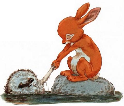 Ёжик снова закрыл глаза. Кролик повёл его к речке — туда, где можно было по камням перейти на другой берег.