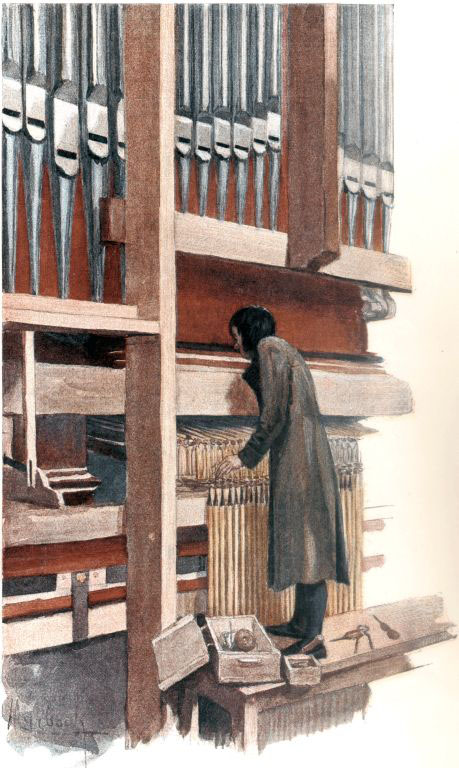 Само собой разумеется, весь наш городок был взбудоражен. Великий музыкант по имени Эффаран, он же великий изобретатель, взялся украсить наш орган регистром детского голоса. И тогда на Рождество после пастухов и волхвов, которым аккомпанируют низкие регистры, раздадутся чистые звонкие голоса ангелов, кружащихся над младенцем Иисусом и Марией. Ремонт начался на следующий же день; мэтр Эффаран с помощником принялись за дело. На переменках все школьники бегали в церковь. Нам разрешали подняться на хоры при условии, что мы не помешаем. Корпус органа был открыт и возвращен к первозданному состоянию. Этот инструмент — не что иное, как флейта Пана[18], наделенная специальным деревянным устройством, мехами и регистрами, иначе говоря, приспособлениями, регулирующими доступ воздуха в трубы. Орган Кальфермата насчитывал двадцать четыре регистра, четыре клавиатуры с пятьюдесятью четырьмя клавишами, а также педальную двухоктавную клавиатуру. Каким дремучим казался нам удивительный лес деревянных и металлических труб! В нем так легко было заблудиться! А какие странные слова слетали с уст мэтра: кромхорн, бомбарда, престант, назард![19] Подумать только, в органе были шестнадцатифутовые регистры из дерева и тридцатифутовые из металла! В его трубах могла бы разместиться вся школа во главе с господином Вальрюгисом! С изумлением, граничащим с ужасом, разглядывали мы беспорядочные нагромождения труб. Один из нас, Хокт, осмелился взглянуть вниз. — Анри,— сказал он,— это похоже на паровую машину… — Скорее на артиллерийскую батарею,— возразил Фарина,— словно пушки, а жерла выбрасывают ядра музыки. Мне же не удавалось придумать сравнения, но когда я представлял себе порывы ветра, вырывавшиеся из огромных труб, меня охватывала дрожь. Мэтр Эффаран продолжал невозмутимо трудиться. Вообще-то, орган Кальфермата оказался в достаточно хорошем состоянии и требовал лишь незначительного ремонта, скорее чистки от многолетней пыли. Труднее оказалось установить регистр детского голоса. Сложное приспособление, заключенное в коробку, состояло из набора хрустальных флейт, откуда должны были литься волшебные звуки. Мэтр Эффаран — прекрасный органный мастер и не менее искусный органист — надеялся, что наконец преуспеет там, где прежде его подстерегали неудачи. Однако я заметил, что действовал он наугад, ощупью, то так, то эдак, и если не получалось, испускал крики, словно разъяренный попугай, которого дразнит хозяйка.