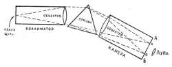 Они показывают, что если не принимать во внимание Плутона, о котором мы знаем еще очень мало, то планеты по диаметру, массе и плотности резкоразделяются на две группы. Меркурий, Венера и Марс мало отличаются от Земли, их называют земноподобными. Последние четыре планеты — планеты-гиганты, они очень велики, имеют большие массы и малую плотность. Время вращения вокруг оси у планет-гигантов значительно короче, чем у земноподобных планет. К тому же Юпитер и Сатурн вращаются не как твердое тело, а по поясам: чем дальше от экватора, тем вращение медленнее. Это показывает, что мы наблюдаем не твердую поверхность Юпитера и Сатурна, а их атмосферы. Массы планет-гигантов во много раз больше массы Земли. Например, масса Урана — почти в 15 раз, Нептуна — в 17, Сатурна — в 95, а Юпитера — в 318. Юпитер обладает мощной силой притяжения и может удерживать вокруг себя даже очень легкие газы. Плотность же планет-гигантов лишь немного больше, чем плотность воды, а у Сатурна даже меньше. Поскольку нам известно очень мало твердых или жидких веществ, обладающих столь малой плотностью, мы можем предполагать, что внешние слои планет-гигантов газообразны или же состоят из очень легких веществ. А значит, атмосферы их достигают громадной толщины в десятки тысяч километров. Изучать физические и химические свойства атмосфер мы можем, пользуясь методом спектрального анализа. Заключается он в следующем. Если мы пропустим свет Солнца через стеклянную призму, то он разложится на составные части в виде цветной полосы, называемой спектром. Спектр по своему строению похож на радугу с более отчетливо разделенными цветами. Солнечные лучи, идущие от наблюдаемой планеты, прежде чем попасть в глаз наблюдателя, дважды проходят через ее атмосферу: падая на планету и затем отражаясь от поверхности. При этом атмосфера частично поглощает некоторые из солнечных лучей, потому что каждый из газов, которые ее составляют, поглощает только вполне определенные лучи, что выражается темными линиями в соответствующих местах спектра. По этим линиям можно судить о природе газа. Следовательно, по спектру можно узнать, через какие газы прошел свет Солнца и планет. А это дает возможность выяснить, из каких газов состоит атмосфера Солнца и планет. На следующей странице приведена схема спектроскопа — прибора, который дает возможность определять, какие лучи поглотила атмосфера. В трубку, называемую коллиматором, вставлен объектив, в главном фокусе которого находится узкая щель (на схеме щель перпендикулярна к плоскости чертежа). Перед щелью помещается источник испытуемого света или изображение небесного светила, даваемое астрономической трубой. Из объектива выходит параллельный пучок света и падает на призму. Она разлагает свет на составные цвета, которые по выходе из призмы еще больше расходятся и попадают в объектив камеры. Этот объектив собирает каждый одноцветный пучок света в своем фокусе на плоскости «АБ». Например, красные лучи собираются в точке «К», фиолетовые — в точке «Ф». Полученный спектр можно рассматривать через лупу. Вставив в камеру кассету с фотопластинкой, получим спектрограф, применяемый для фотографирования спектра.